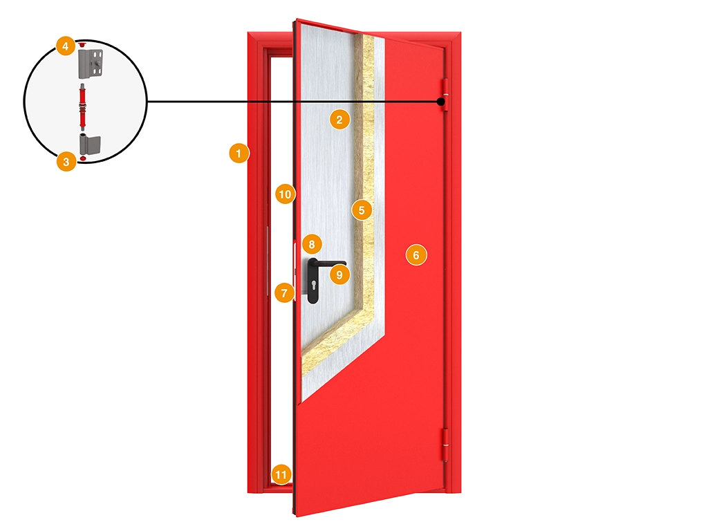 Дверное полотно из оцинкованной стали утеплено минеральной ватой. Ключевым преимуществом противопожарной одностворчатой двери является эластичный уплотнитель из термоэластопласта. При повышении температуры он увеличивается в объеме и герметизирует дверной проем.