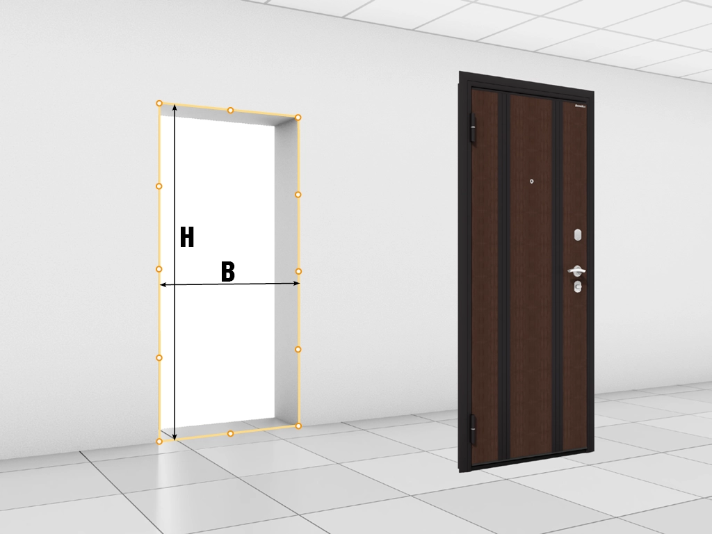 Замерьте высоту дверного проема (H) от выведенного, чистого пола. Для правильного замера необходимо знать точное положение нулевой отметки. Запишите минимальное значение.