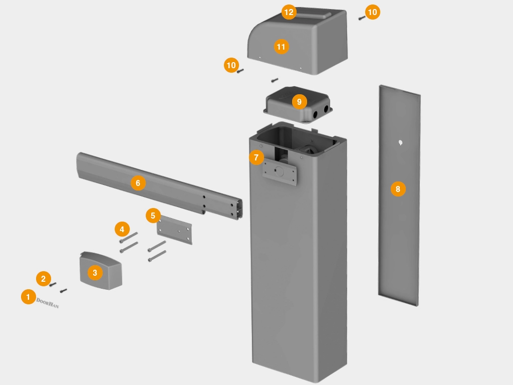 Стойкa шлагбаума со встроенным блоком управления, крепежные элементы, пружина.